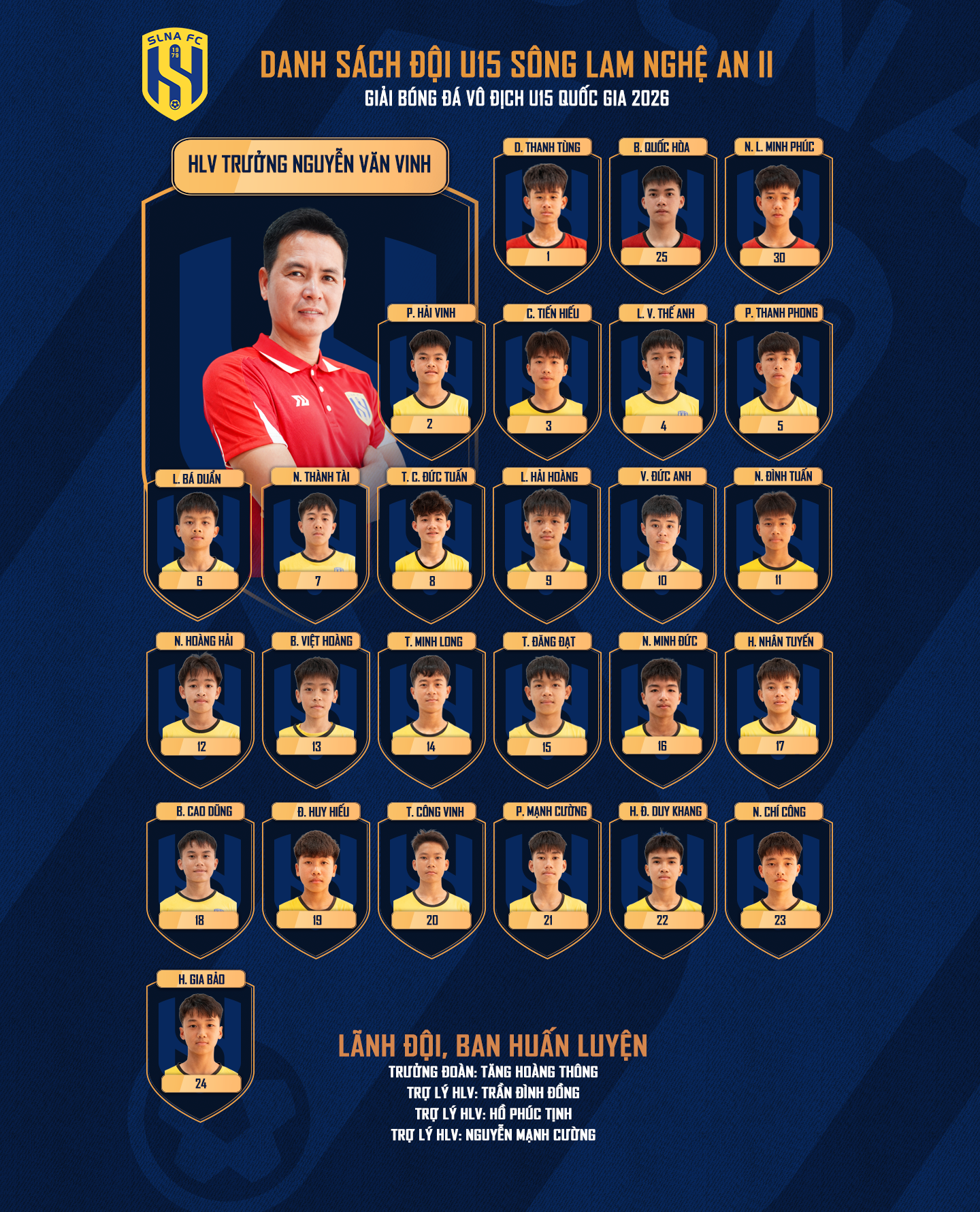 Đội U15 Sông Lam Nghệ An I do HLV Lê Văn Hùng dẫn dắt gồm các cầu thủ nòng cốt sinh năm 2011 vô địch Giải bóng đá U13 toàn quốc năm 2024. Đây là lứa cầu thủ được tham gia tập huấn tại các nước như Nhật Bản, Trung Quốc và Giải bóng đá U14 các Câu lạc bộ phía Bắc. Còn đội U15 Sông Lam Nghệ An II do HLV Nguyễn Văn Vinh dẫn dắt bao gồm nhiều các cầu thủ sinh năm 2012, giành Huy chương Bạc U13 toàn quốc năm 2025 của Trung tâm đào tạo trẻ SLNA.