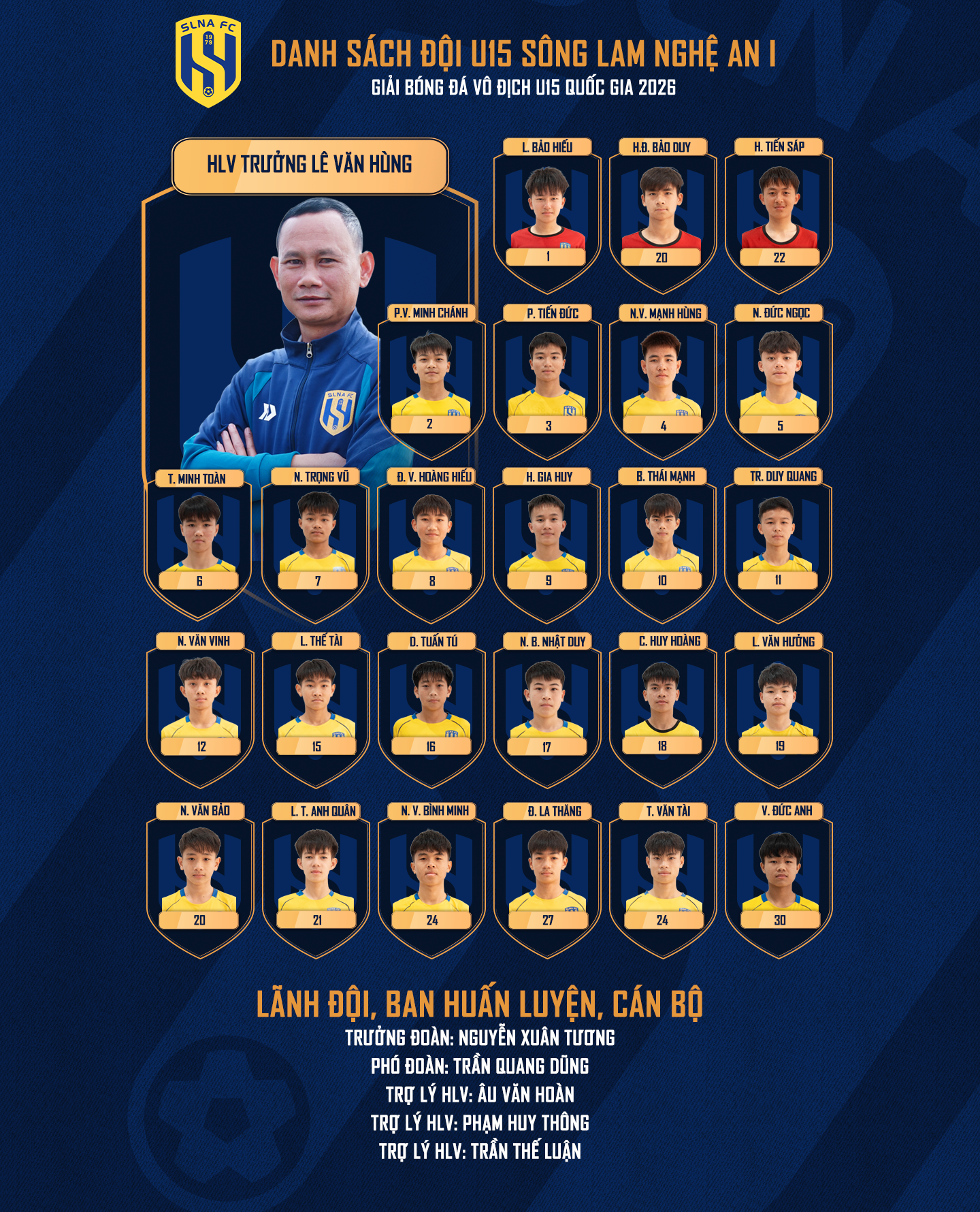 SLNA FC – Tại Giải Bóng đá Vô địch U15 quốc gia 2026, Sông Lam Nghệ An có 2 đại diện tham dự. Trong đó, Sông Lam Nghệ An I nằm tại bảng B, Sông Lam Nghệ An II nằm ở bảng C.